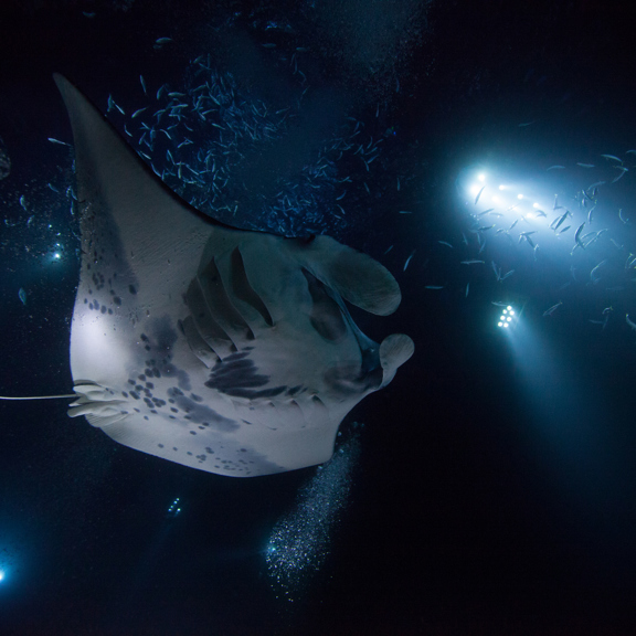マンタが水面に出てプランクトンを濾過摂食する様子を見ることができます。シュノーケラーの浮き輪が周囲のプランクトンを照らすと、近くのマンタが光に引き寄せられて餌をやる時間に集まり、 あなたは彼らと一緒に浮かぶことができます。