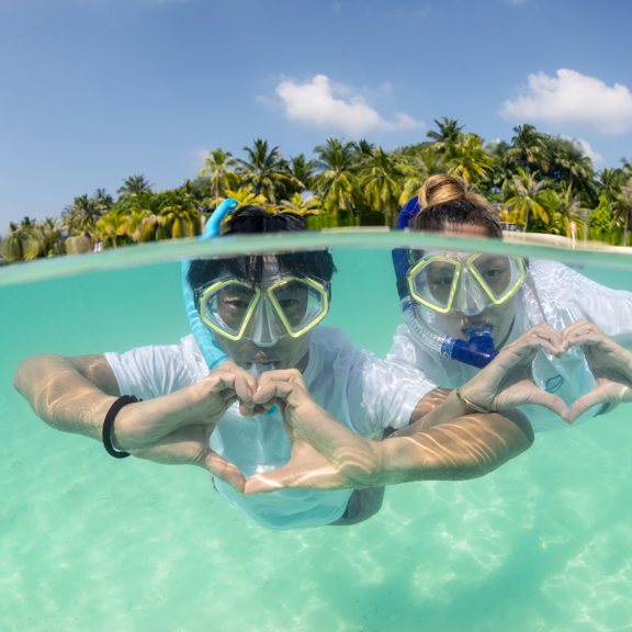 OUTRIGGER Maldives Maafushivaru Resort sits on a tiny island ringed by a house reef teeming with marine life. Snorkeling here feels like swimming in a dream – colorful fish, graceful rays and the occasional sea turtle glide through crystal-clear waters.